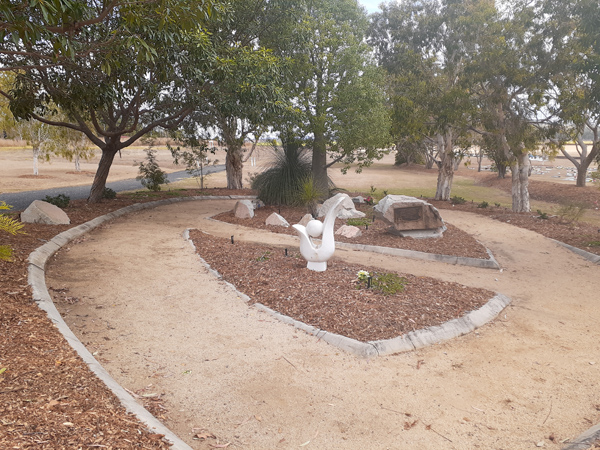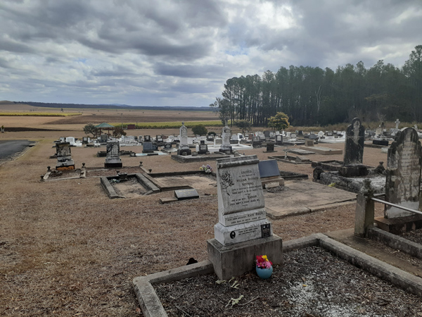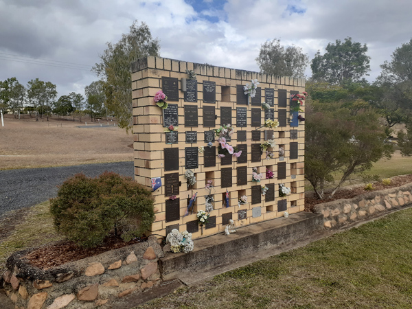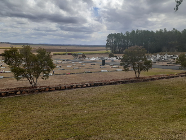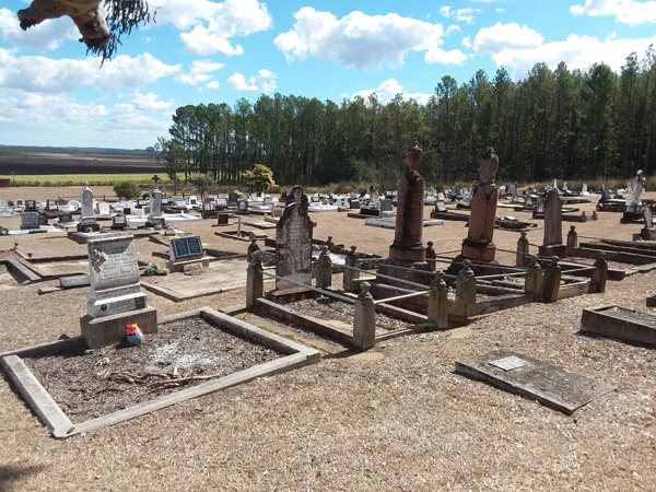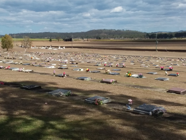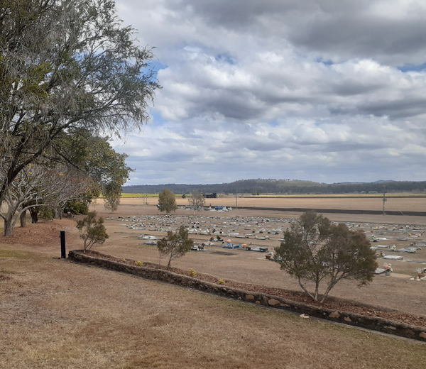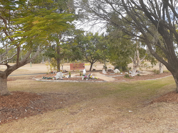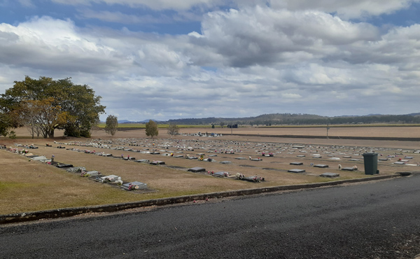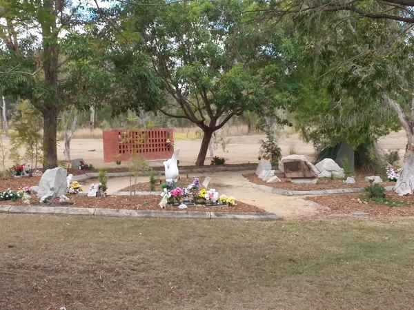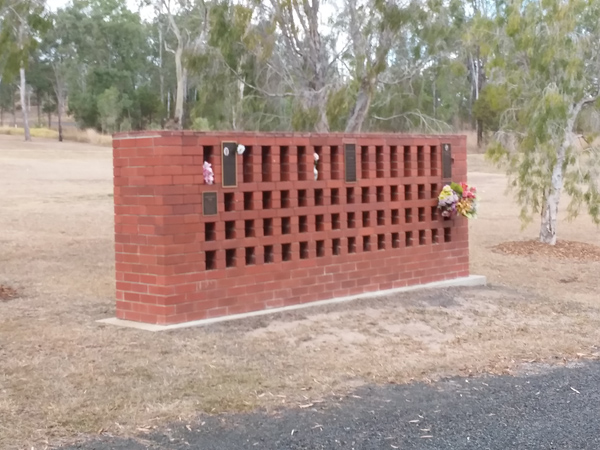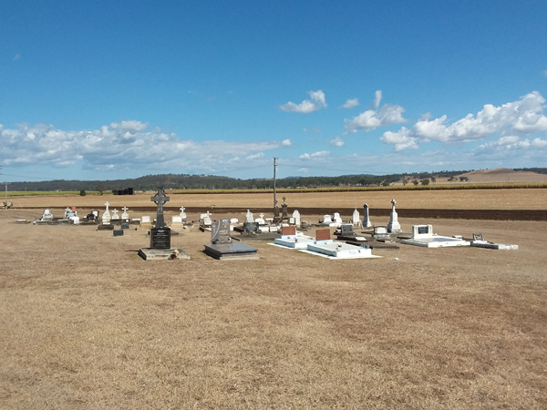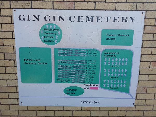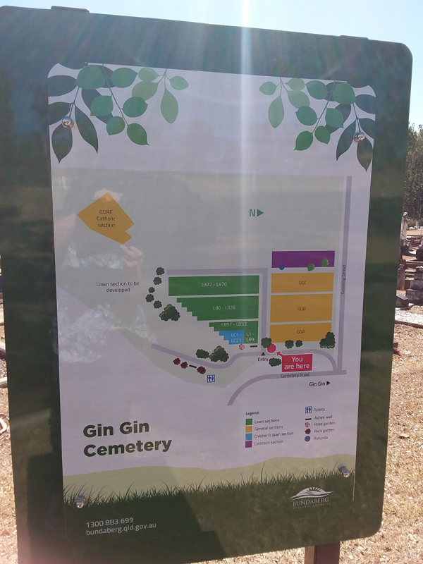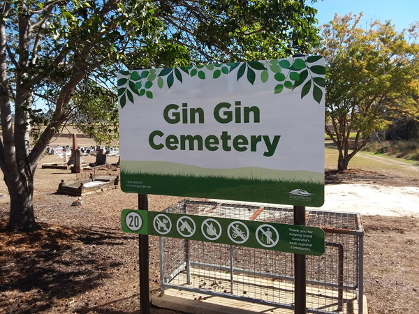 GPS: LAT: -24.997356 LONG: 151.947973 The Gin Gin cemetery reserve was created in 1890. It is located on the outskirts of town, one kilometre southwest of the CBD. The cemetery is located on sloping terrain, offering views over the surrounding landscape. The site is bounded by Gossling Street to the north, Cemetery Road in the east and farmland in the south and west. Approximately one quarter of the 5.5 hectare site appears to include marked graves; on the eastern boundary and in the southwest. There are some mature trees on the north-eastern perimeter, especially on the corner section where there also is a sign reading ‘GIN GIN CEMETERY' and the remnants of a structure including footings and steps. Other vegetation in the cemetery includes landscaping with feature trees and shrubs separating some sections of the cemetery. Main vehicular access to the unfenced site is from the east past a small brick wall segment with information signage. Inside the cemetery the wall functions as a Columbarium Wall. A bitumen driveway divides the lawn cemetery on the southern side from the monumental section in the north. In both sections the graves are arranged in rows. The grave ornaments in the monumental cemetery reflect the changing funerary customs from the late 1800s to the present day. Surrounds include concrete and rendered brick, wrought iron fencing and piping suspended between posts. There is a variety of headstones ranging from simple mounted tablets to stelae and crosses as well as a number of monuments. The Catholic section of the monumental cemetery is separate from the main monumental section and is located in the southwest of the cemetery. Grave ornamentation is similar to the general monumental section. A post and two-rail fence and landscaped garden bed separate the Paupers Memorial Section, consisting of a grassed area in the northwest. A small shelter structure is located close by. A Memorial Garden and second Columbarium Wall are located on the eastern boundary. |