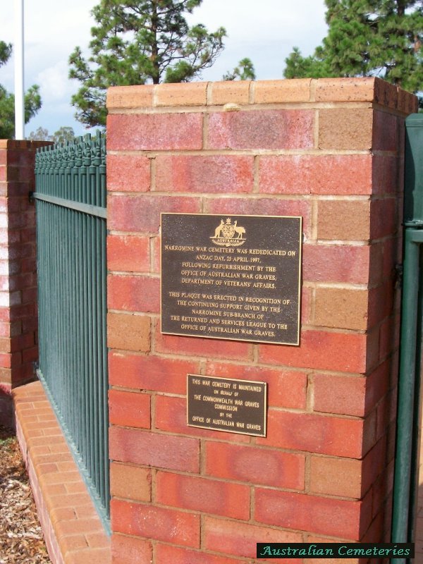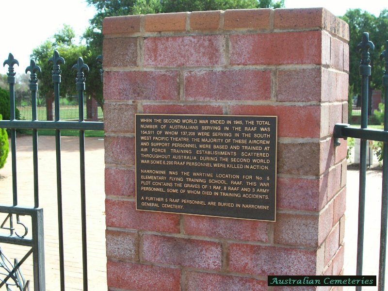 | Narromine was the Wartime location for No 5 Elementary Flying Training School, RAAF. This War Plot contains the graves of 1 RAF, 8 RAAF and 3 Army Personnel, some of whome died in training accidents. A further RAAF Personnel are buried in Narromine General Cemetery. |