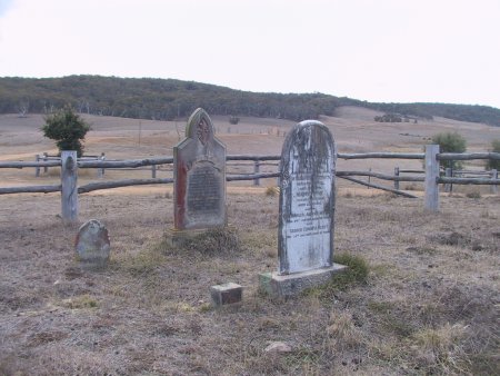 Location: This cemetery is located on private property. The turn off to the property is 12.8 klms from Bungendore on the Braidwood Road. Burials in the family plot are those of the Scott family, original owners of the property. Total names:9, Only six of the named listed on the headstones are buried in the family plot. |