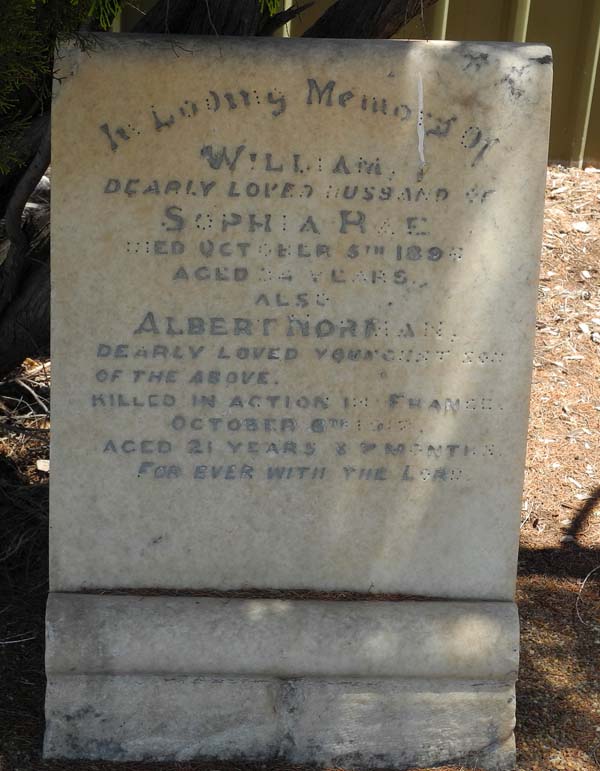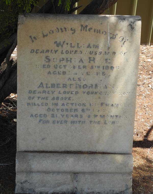 | RAE | Albert Norman | photo | 1917-10-6 | 21 y 7 m | youngest son of Sophia Rose & William. Killed In action |